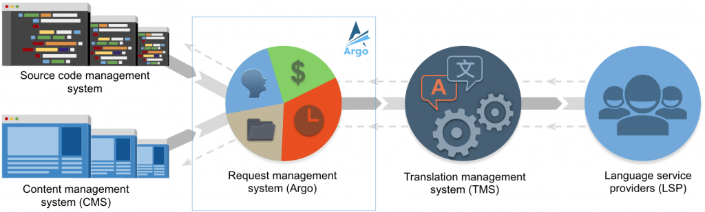 Conceptually, users or systems initiate translation requests, localization project managers manage these requests in Argo, and language service providers (LSPs) manage the translation projects in the TMS. In this model, all parties work in systems specifically designed for their roles. For example, Argo is not intended to be used directly by linguists.